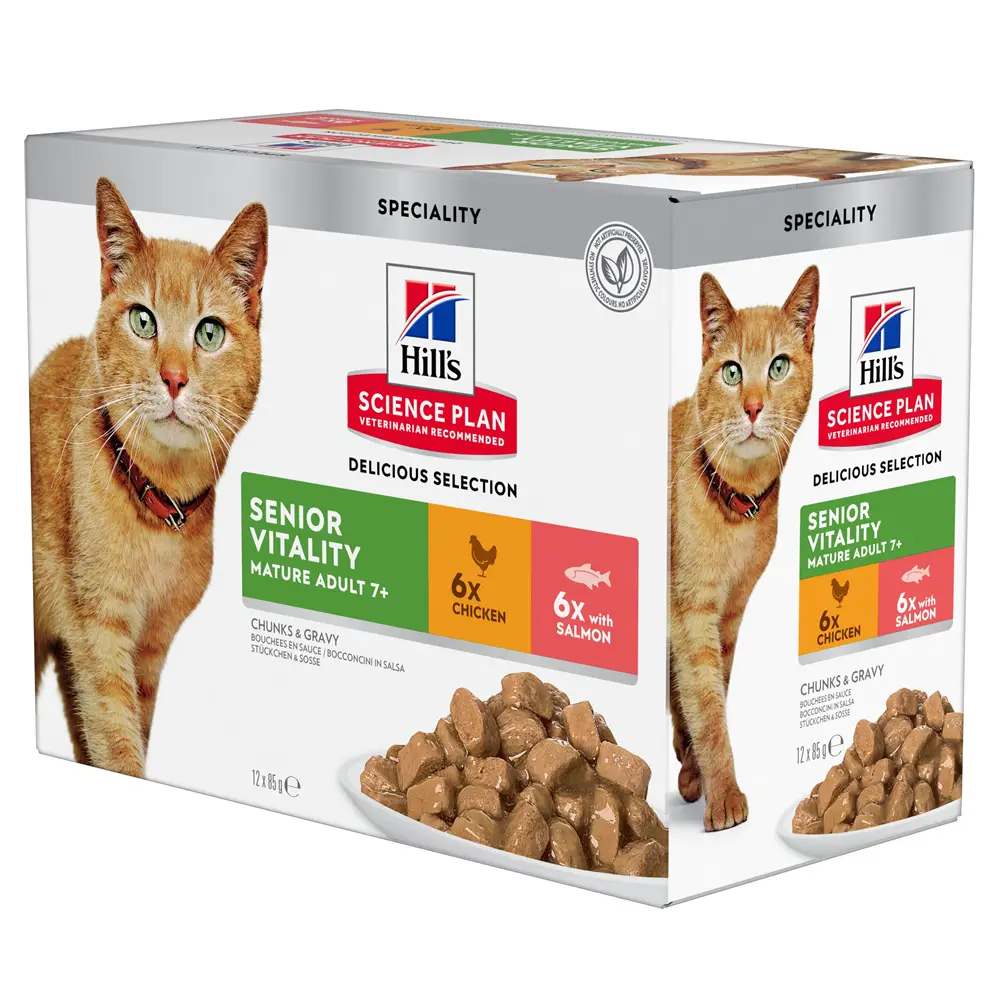 Hills Katzenfutter ab 7 Jahren in Sauce mit Huhn und Lachs 12 x 85 gr